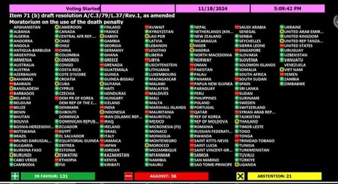 At the beginning of this week, there was a vote at the 79th Session of the United Nations General Assembly on a draft resolution on the moratorium on the use of the death penalty. 131 UN member states voted in favour of the moratorium and 21 countries—including Indonesia, Thailand, Laos and Vietnam—abstained. 36 member states voted "No" on the moratorium. Singapore, of course, was one of them.