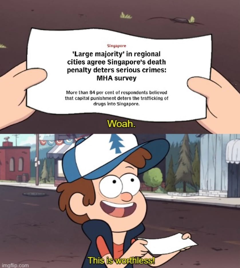 ☠️ The Ministry of Home Affairs is back with a survey claiming that a “large majority” of people from the region believe that Singapore’s death penalty is an effective deterrent to drug trafficking. Once again, a whole bunch of people believing that the death penalty is a deterrent doesn’t prove that it actually is a deterrent!