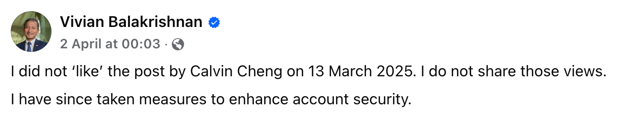 Tan later responded to MPS and said he might have "accidentally clicked that". He unliked the post and said that he didn't agree with Cheng. It took Vivian a longer time to respond, and when he did, his statement immediately invited more questions:
