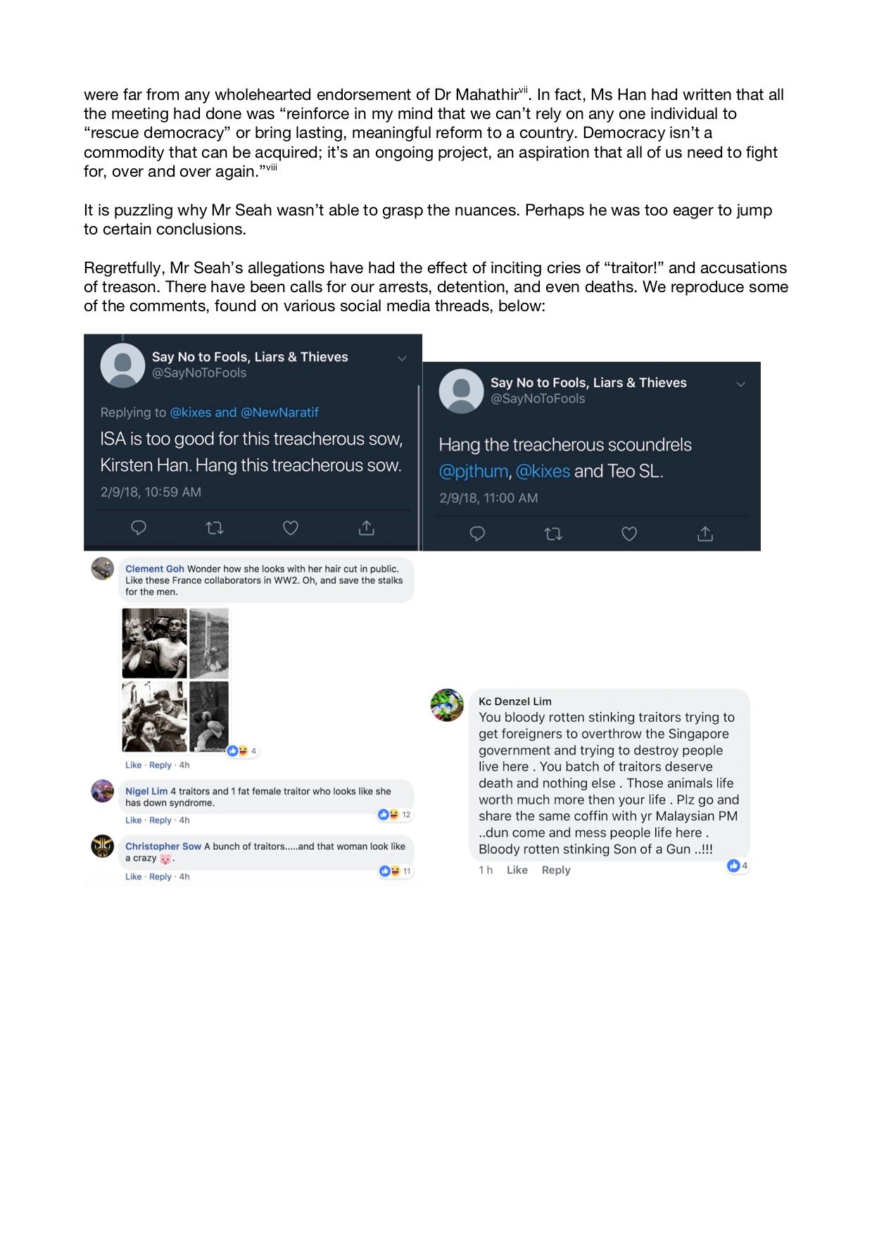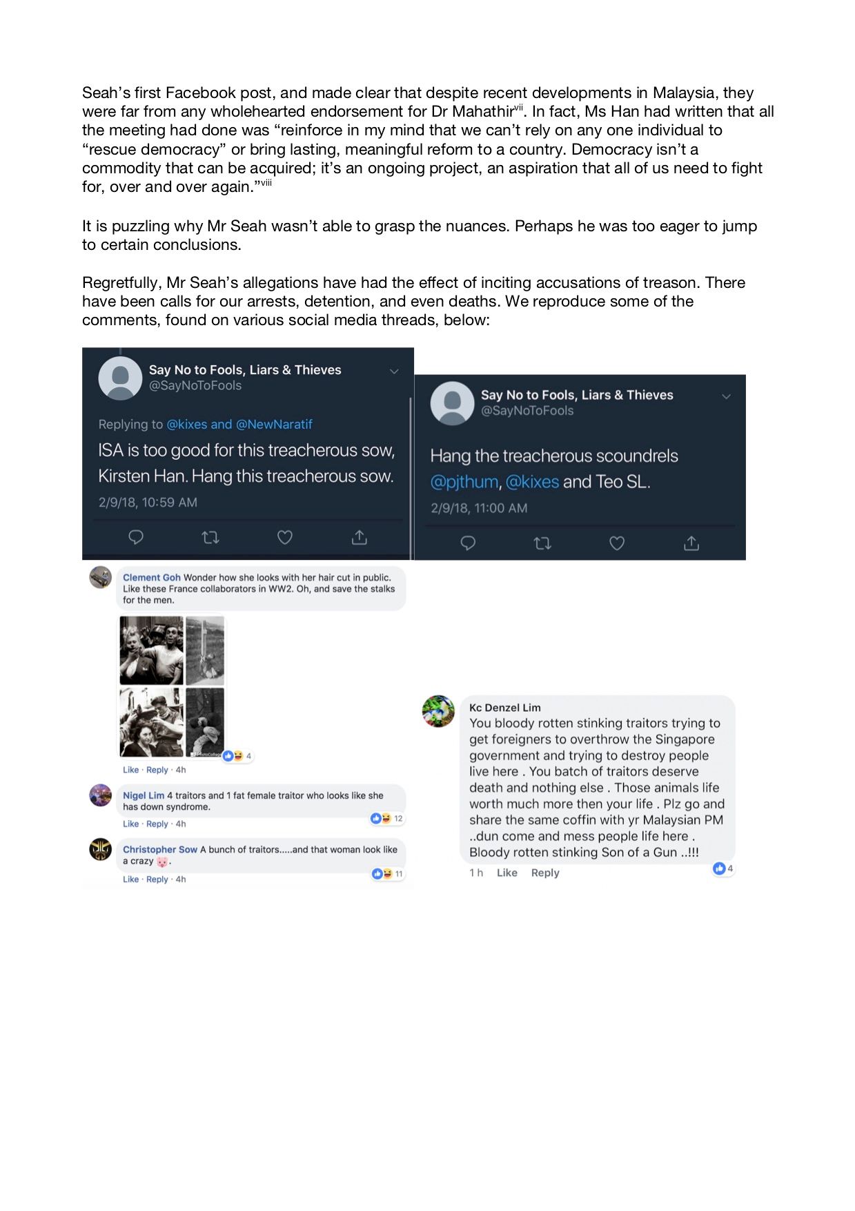 Mr Seah hasn’t provided any evidence for his accusations, which triggered a torrent of abuse and calls for us to be arrested, jailed/detained without trial, or even executed/killed on multiple social media pages and in comment threads. On Monday, Mr Seah finally put out a follow-up post urging civility, but it was really too little, too late. And he still hasn’t retracted his baseless allegations, which have already been amplified by the PAP Facebook page, Law Minister K Shanmugam (on Facebook and in comments to the media), and the mainstream media.