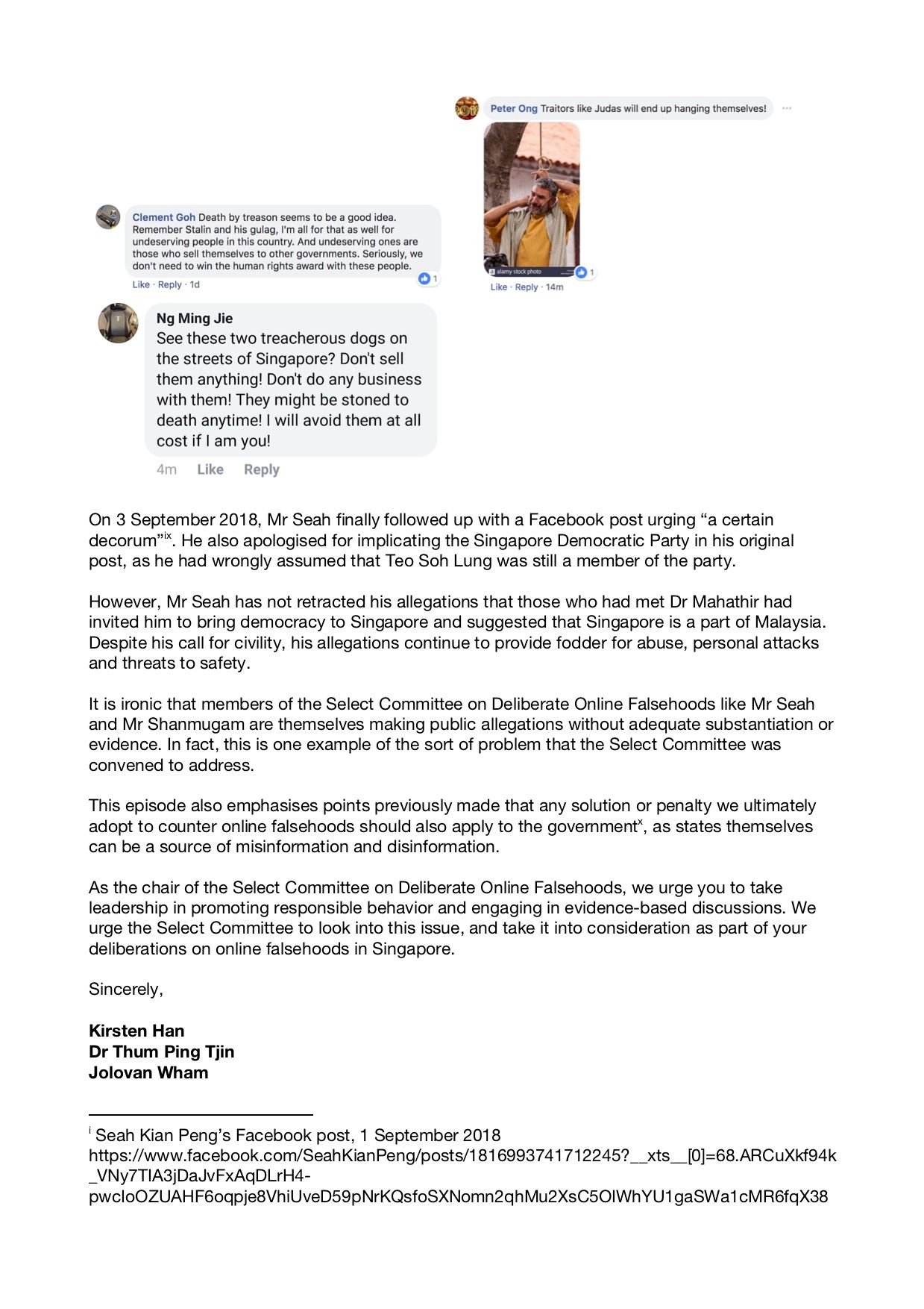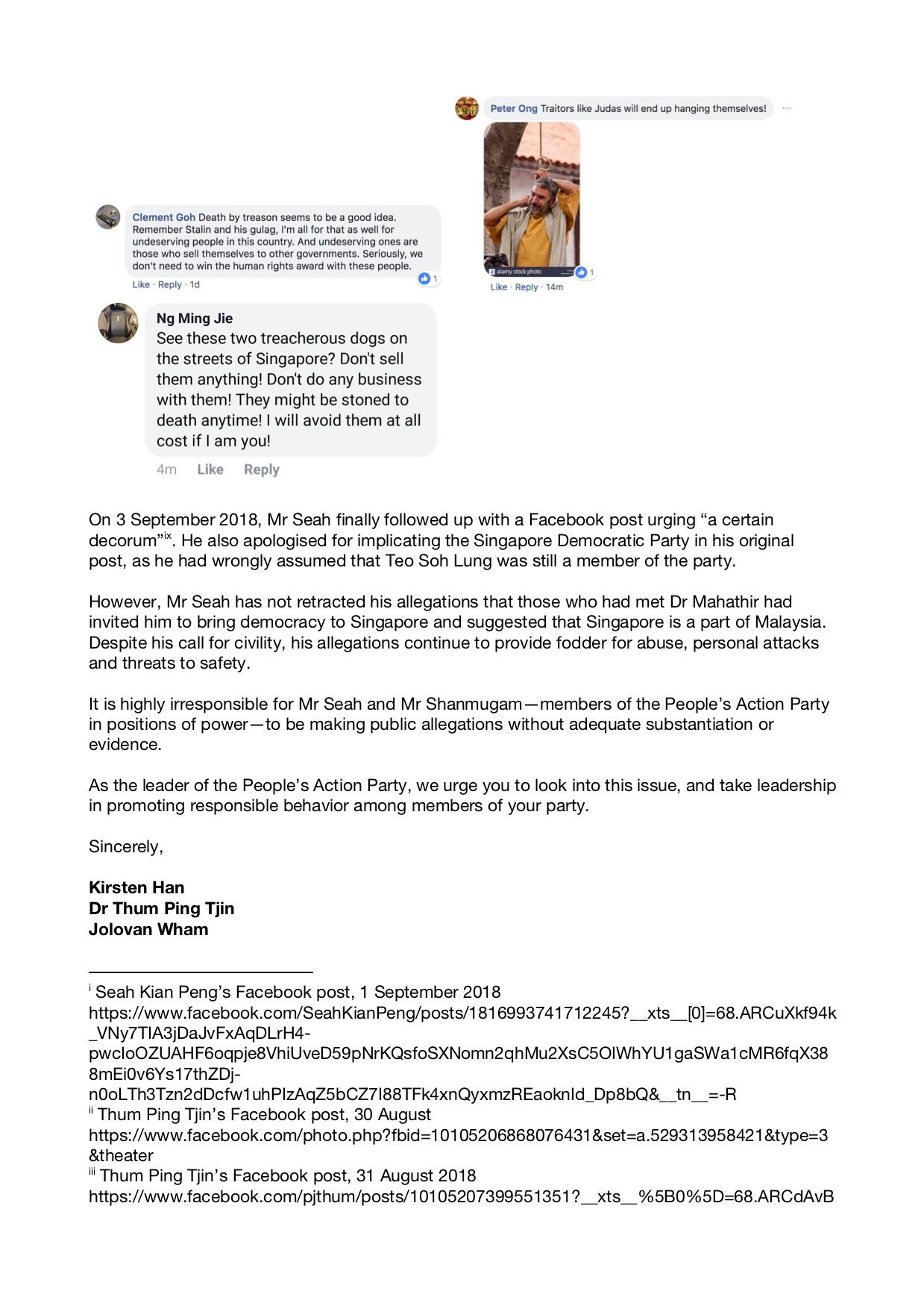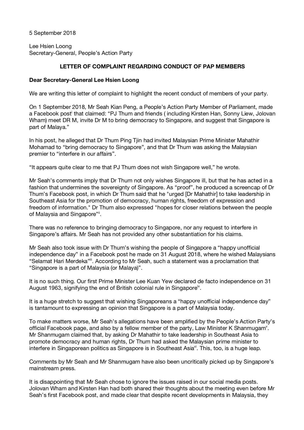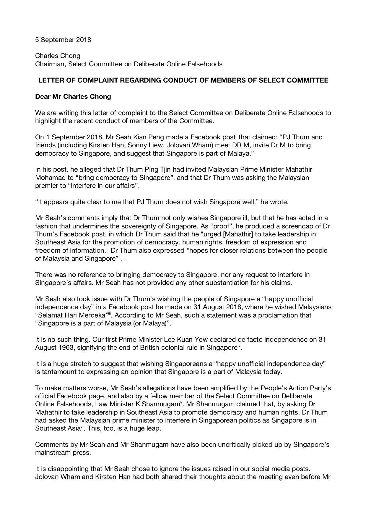 Dr PJ Thum, Jolovan Wham and I have thus filed complaints with Prime Minister Lee Hsien Loong, who is Secretary-General of the political party Mr Seah belongs to, and also with Mr Charles Chong, who is the chairman of the Select Committee on Deliberate Online Falsehoods, of which Mr Seah is a member. This is about accountability and responsibility. I’ve attached JPEG files of the letters we sent below.