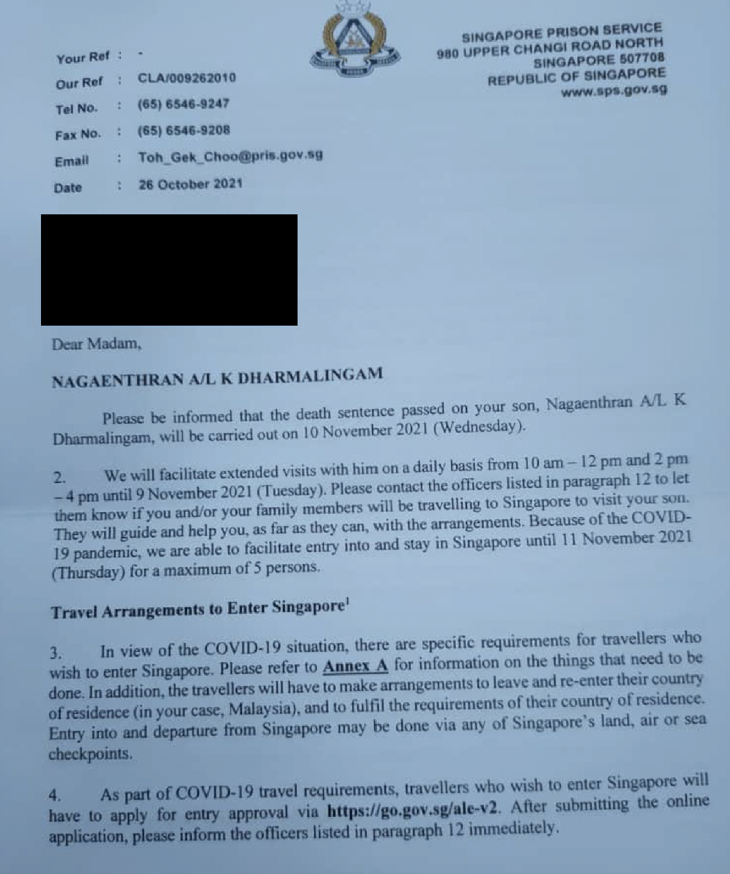 Nagaenthran’s family live in Malaysia. Although Singapore has launched Vaccinated Travel Lanes (VTL) with multiple countries, allowing fully vaccinated individuals to travel without having to quarantine, there is no such arrangement with our neighbour to the north. The notice of Nagaenthran’s execution thus came with pages of Covid-19 travel guidelines and requirements.