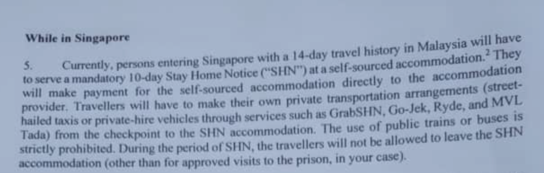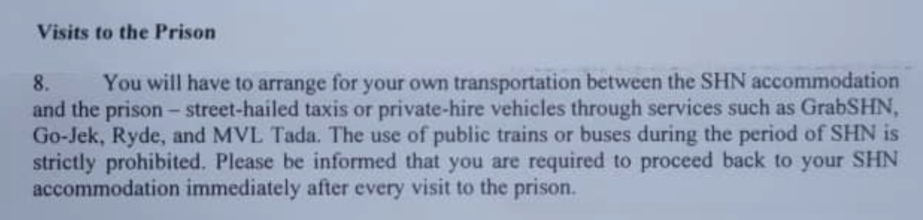 - Since they are “strictly prohibited” from taking public transport during this time, they will have to figure out, and pay for, their own SHN-approved transport to and from prison.