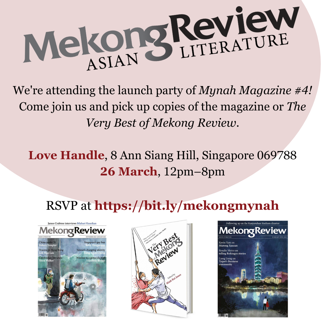 This weekend I'll be running a little booth selling Mekong Review magazines and books at the launch of the fourth issue of Mynah Magazine! Come down to say hi and support Mynah (and Mekong Review, and the other publications that will be there). RSVP here.