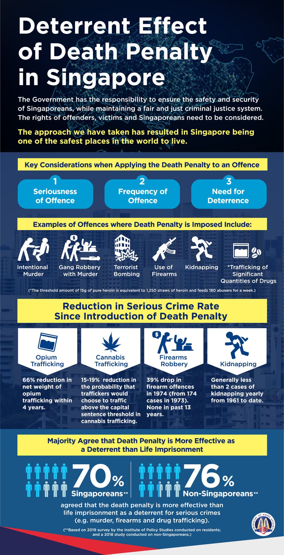 The Workers’ Party’s Jamus Lim filed parliamentary questions on whether the government has commissioned any studies to determine the deterrent effect of the death penalty. Minister of Home Affairs K Shanmugam gave a written answer which MHA has helpfully also made into this infographic: