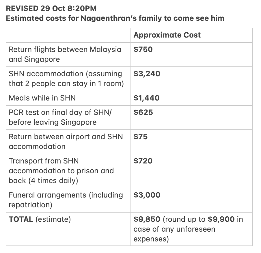 Naga has since exhausted all his appeals, including his appeal to the president for clemency, which is why the authorities have scheduled his execution. His family live in Malaysia, which means that, on top of the distress over the looming execution, they have to navigate all the Covid-19 regulations in both countries to come to Singapore to see him for what will most likely be the last time. It's a logistical nightmare: family members have to rush to apply for leave from work at short notice and work out who can come and when, figure out when to take PCR tests, apply for entry approval and make health declarations, find SHN accommodation, arrange SHN-approved transport, and even have funeral arrangements ready in case the worst happens.
