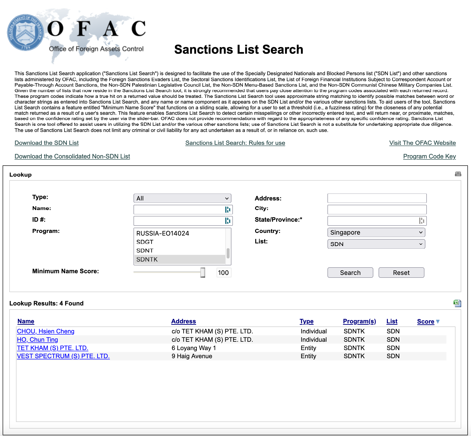 A man named Chou Hsien Cheng was on the list. When I went further down the hyperlink rabbit hole, I discovered that Chou is Singaporean and linked to the companies Tet Kham (S) Pte. Ltd. and Vest Spectrum (S) Pte. Ltd., both of which were also on the designation list. Both those companies were registered in Singapore. According to a search of the SDN database I did yesterday, Chou and the two companies are still designated.