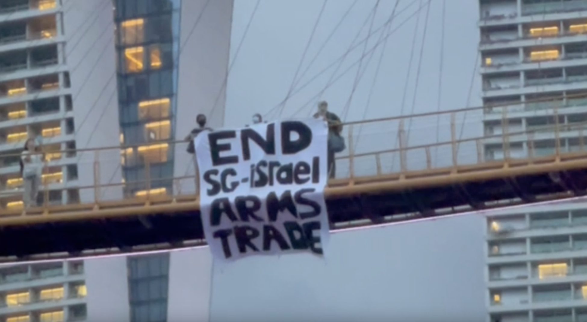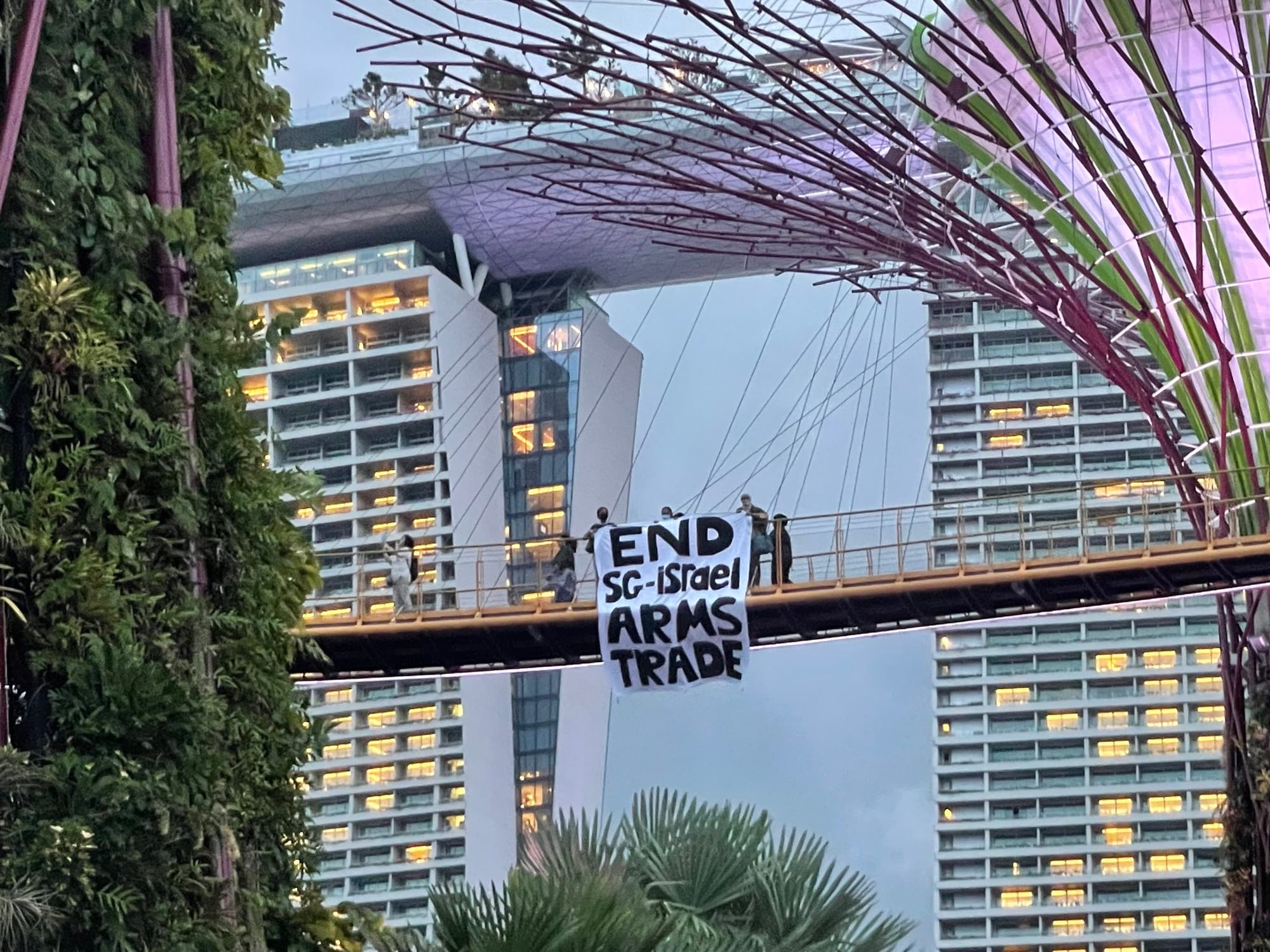 As tired office workers logged out of their computers on Monday evening to begin the commute home, three Singaporeans stood on the OCBC Skyway at Gardens by the Bay and unfurled a huge banner reading: "END SG-ISRAEL ARMS TRADE". They only stayed for a few minutes, but it was already a big, brave action—the authorities have made it clear that, unless state-sanctioned, all public events related to Israel and Gaza are illegal.