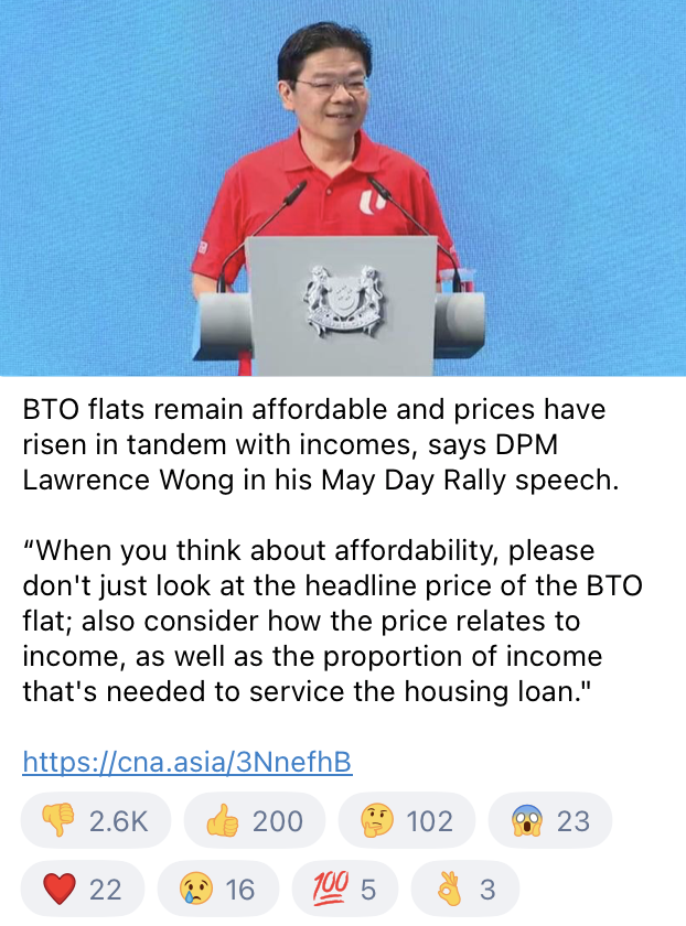 The government had their own May Day Rally as usual, here Lawrence Wong, the deputy prime minister, claimed that BTO HDB flats are still affordable because prices have moved alongside rising incomes. From what I’ve seen, this claim has not gone down particularly well. Just look at this ratio on CNA’s Telegram channel: