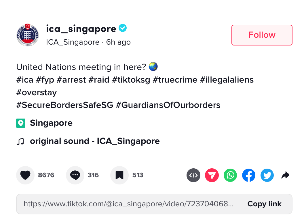I’m referring to a recent video on the Immigration & Checkpoints Authority (ICA) TikTok page on raids and arrests they’ve conducted to catch people suspected of immigration offences. I’m not going to link it because I don’t want to direct more eyeballs to it — and at the time of editing this newsletter, it looks as if it's been taken down — but it’s basically a video, overlaid with sped-up pop music, of people arrested by ICA officers during immigration raids. There are black bars put over their eyes in an attempt to censor the image, but people might still be identified. The caption says: "United Nations meeting in here? 🌏 #ica #fyp #arrest #raid #tiktoksg #truecrime #illegalaliens #overstay #SecureBordersSafeSG #GuardiansOfOurborders”
