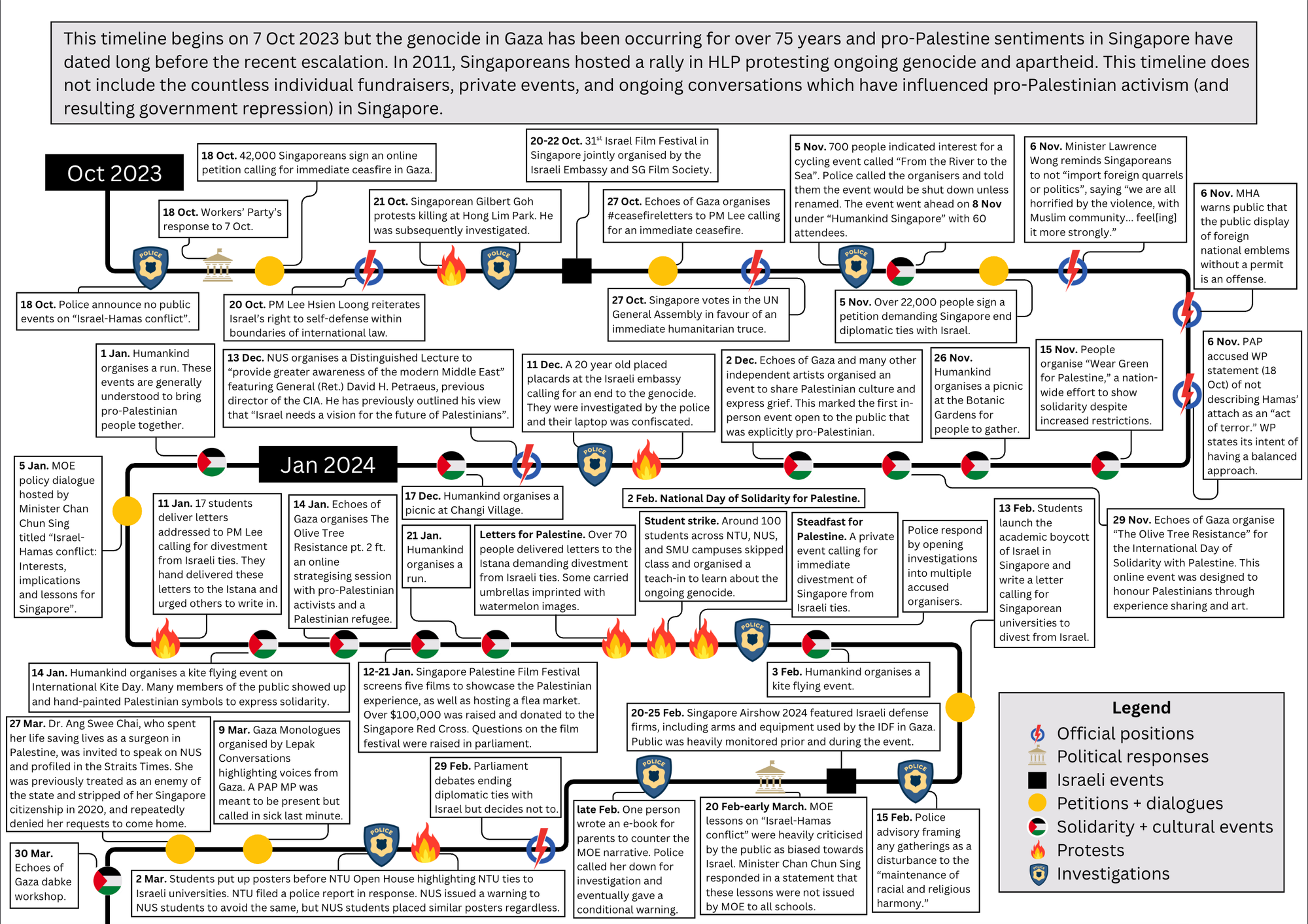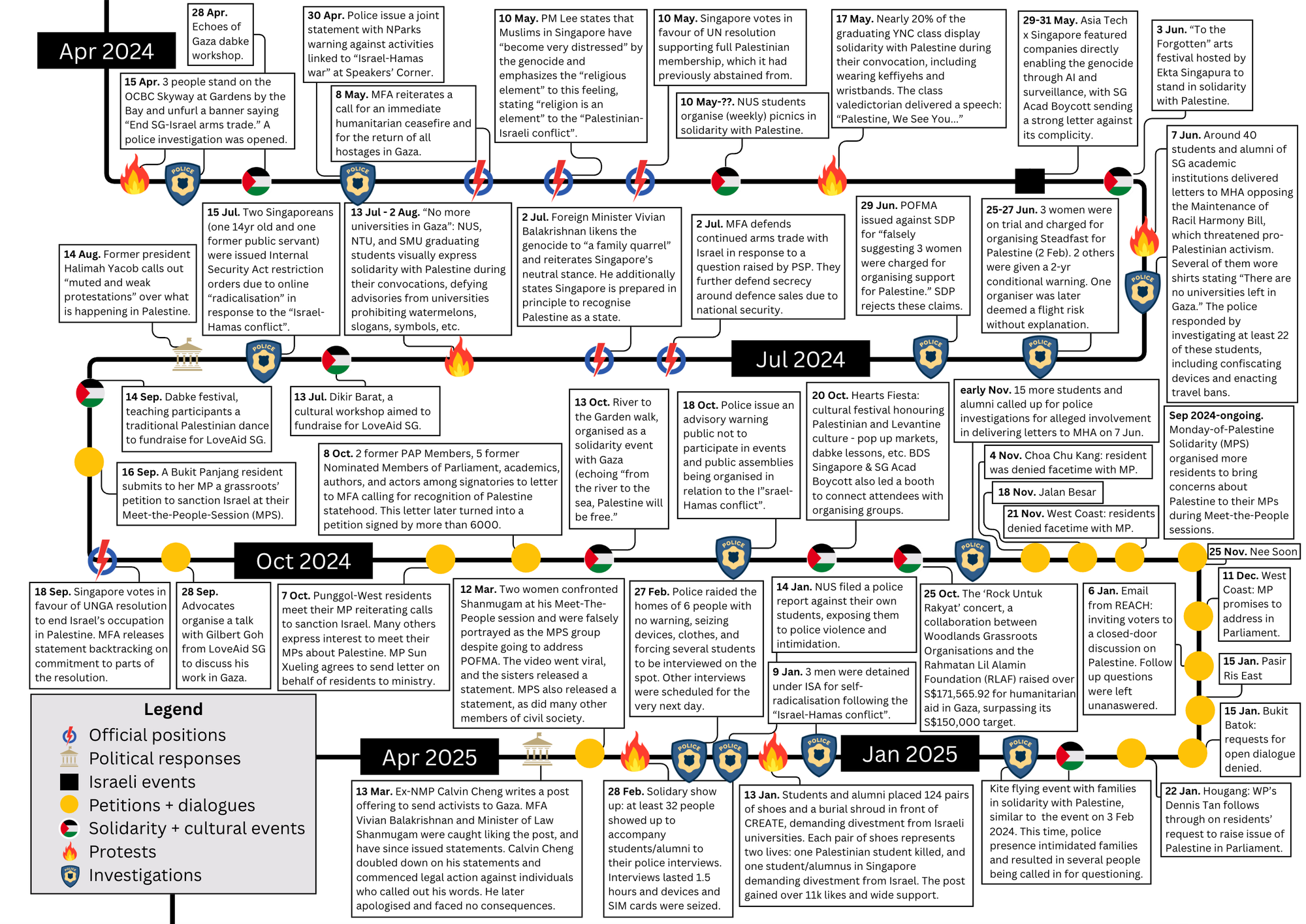 Still, there has been plenty of activity. There have been social media posts and film screenings and joint letter deliveries and posters stuck around university campuses and staged memorials and cultural events and kite-flying gatherings and picnics and teach-ins and protests and even limited hunger strikes spread over a few weekends. Chapter 3 of Still Steadfast is a chronological, narrative timeline of Palestine-related developments—both positive and negative—in Singapore since 2023; it's more than 20 pages long, and still there were things that had to be left out so it didn't go on and on and on.