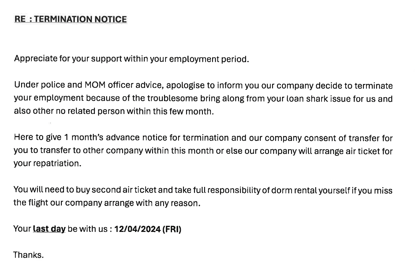 In the termination notice Sharif showed me, the letter says: “Under police and MOM [Ministry of Manpower] officer advice, apologise to inform you our company decide to terminate your employment because of the troublesome bring along from your loan shark issue for us and also other no related person within this few month.” It also expresses the company’s willingness to transfer him to another employer, should he find one within a month. Otherwise, Sharif will be sent back to Bangladesh. The letter states that his official last day is 12 April 2024.