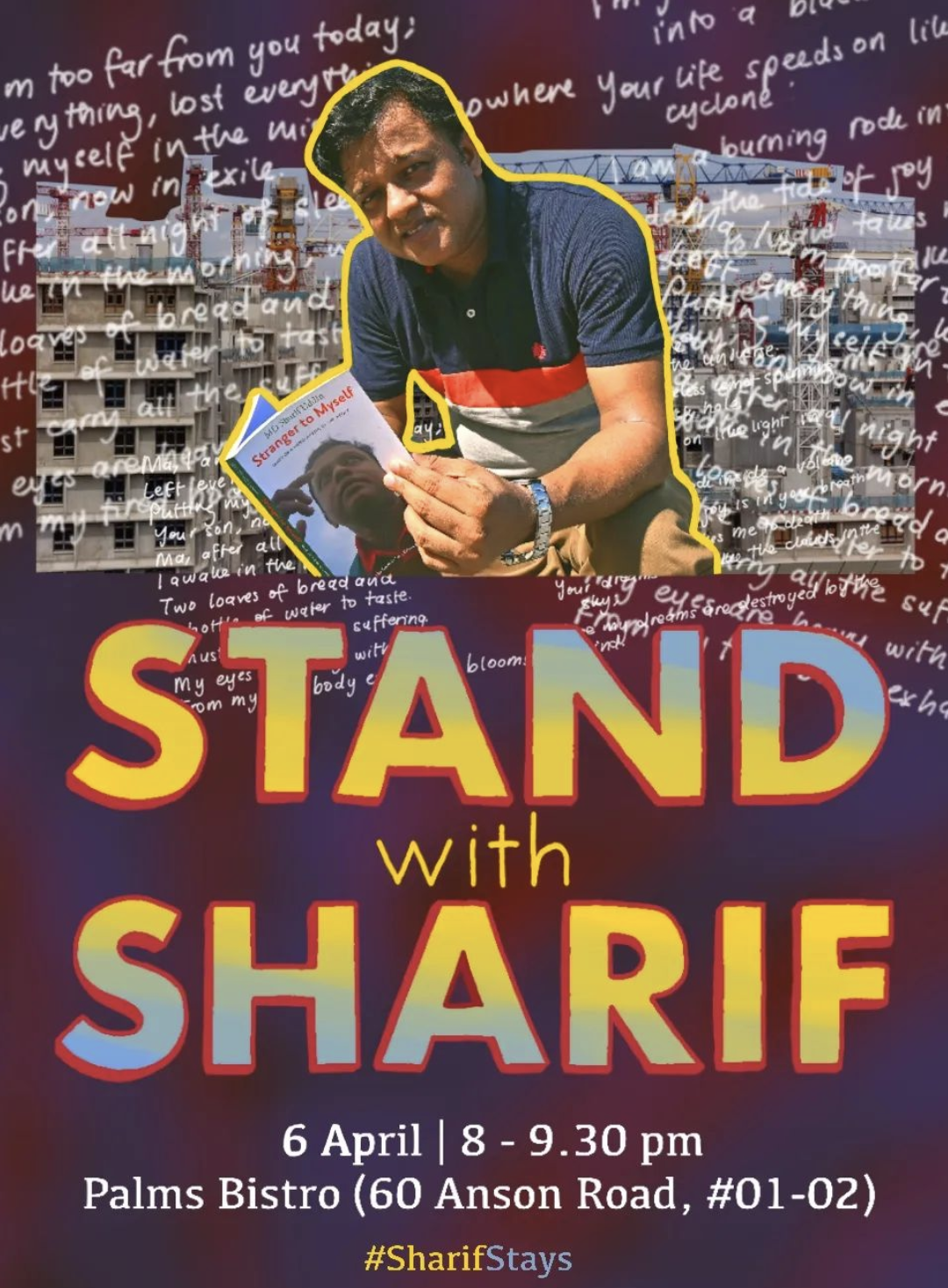 In solidarity with and support of Sharif, Workers Maker Possible and Students for Migrant Rights have organised Stand With Sharif, an event to draw attention to his situation. There will be readings of passages from his books, as well as the sharing of messages of solidarity and a reflection of the state of migrant workers’ rights in Singapore.
