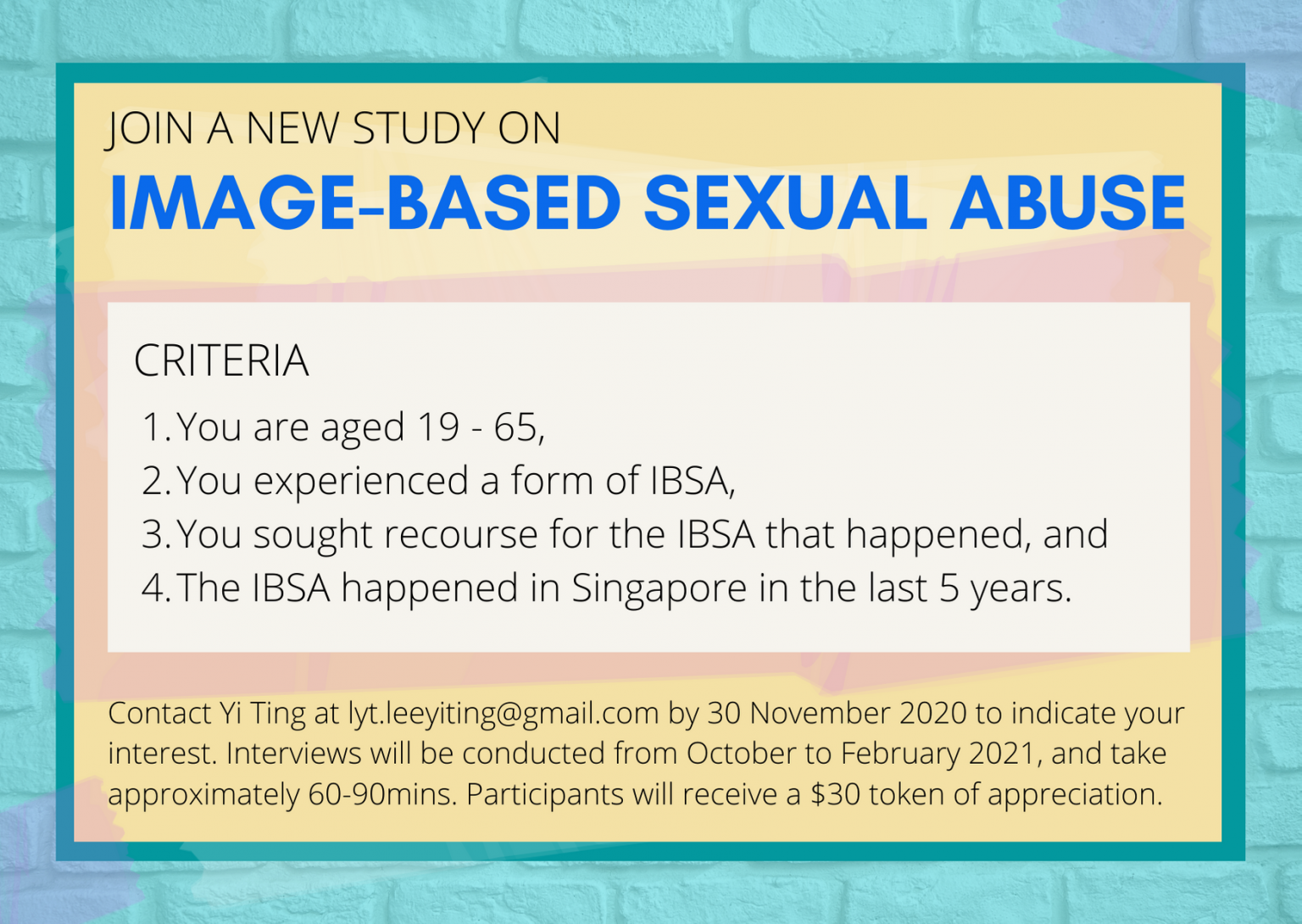 Researchers are looking for respondents for studies on image-based sexual abuse and online harms in Singapore — please help them get the word out! You can find more information here.
