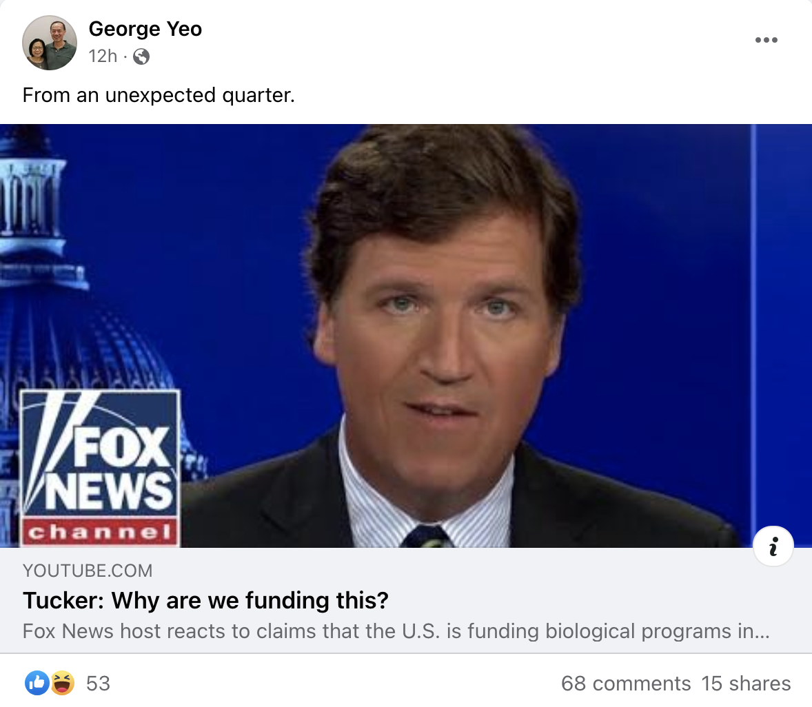 In a sickening development none of us needed, former Minister for Foreign Affairs George Yeo is now sharing disinformation. He shared a Tucker Carlson video in which Carlson is parroting the conspiracy theory pushed by Russia and China that there are secret US-run biolabs in Ukraine. This claim has not only already been debunked, it's also dangerous to amplify but it's yet one more narrative to justify Putin's act of aggression, and there are fears that it could also provide cover for Putin to deploy bioweapons. It's also bad that George Yeo is sharing it, because he still commands a lot of respect and trust from Singaporeans.